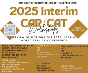 These workshops are to review motions for the 2025 Interim World Service Conference. Please look closely at the flyer as the dates and locations change. All meetings will be held on Zoom however we want as many addicts as possible to attend!!! Next chance to attend will be 1/11/2025 (Roswell), 1/12/2025 (Farmington), 1/16/2025 (Zoom only), and 1/18/2025 (El Paso).