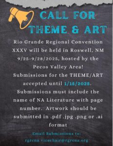 Rio Grande Regional Convention of Narcotics Anonymous is looking for submissions for a theme and artwork! Submissions will be accepted until January 15, 2025. Submissions must include the name of NA Literature with page number and artwork should be submitted in .pdf, .jpg, .png, or .ai format.