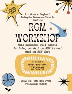 The Rio Grande Regional Delegate Resource Team is hosting an RCM Workshop.