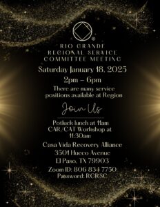 RGRSC meeting will be held Saturday, January 18, 2025, at Casa Vida Recovery Alliance. There are many service opportunities up for grabs! The El Paso Area will host a potluck at 11 am and the CAR/Cat workshop will start at 11:30 am. This meeting will also be available on Zoom.